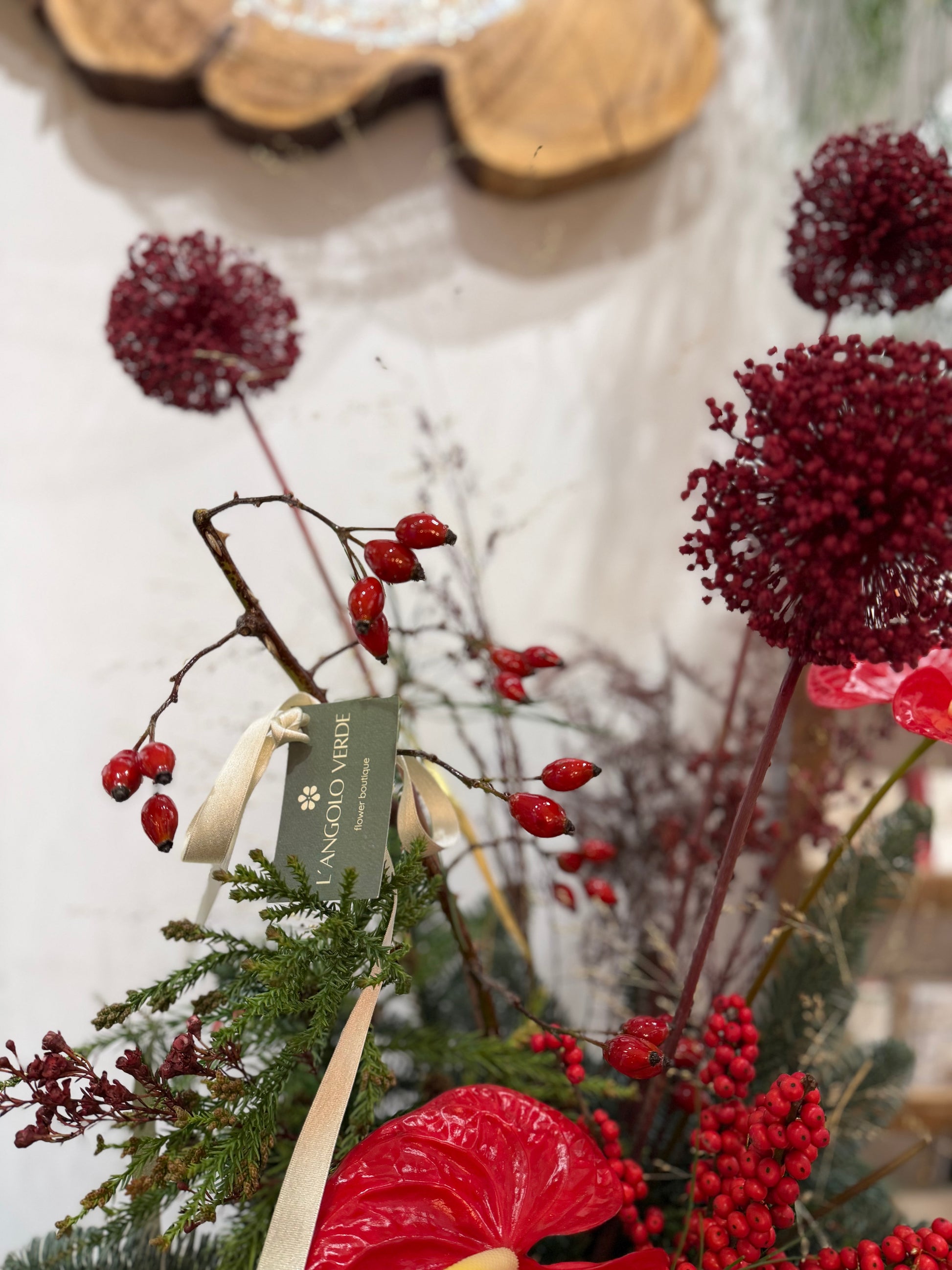 Regala un tocco di originalità con questa elegante cappelliera decorativa. Questa composizione è realizzata con un mix di fiori freschi e secchi, tra cui fiori secchi di aglio, affascinanti anthurium e bacche rosse, il tutto accompagnato da freschi rami verdi. Perfetta per ogni occasione, è un regalo ideale per sorprendere amici e familiari e per portare un’atmosfera festiva e vivace in qualsiasi ambiente.