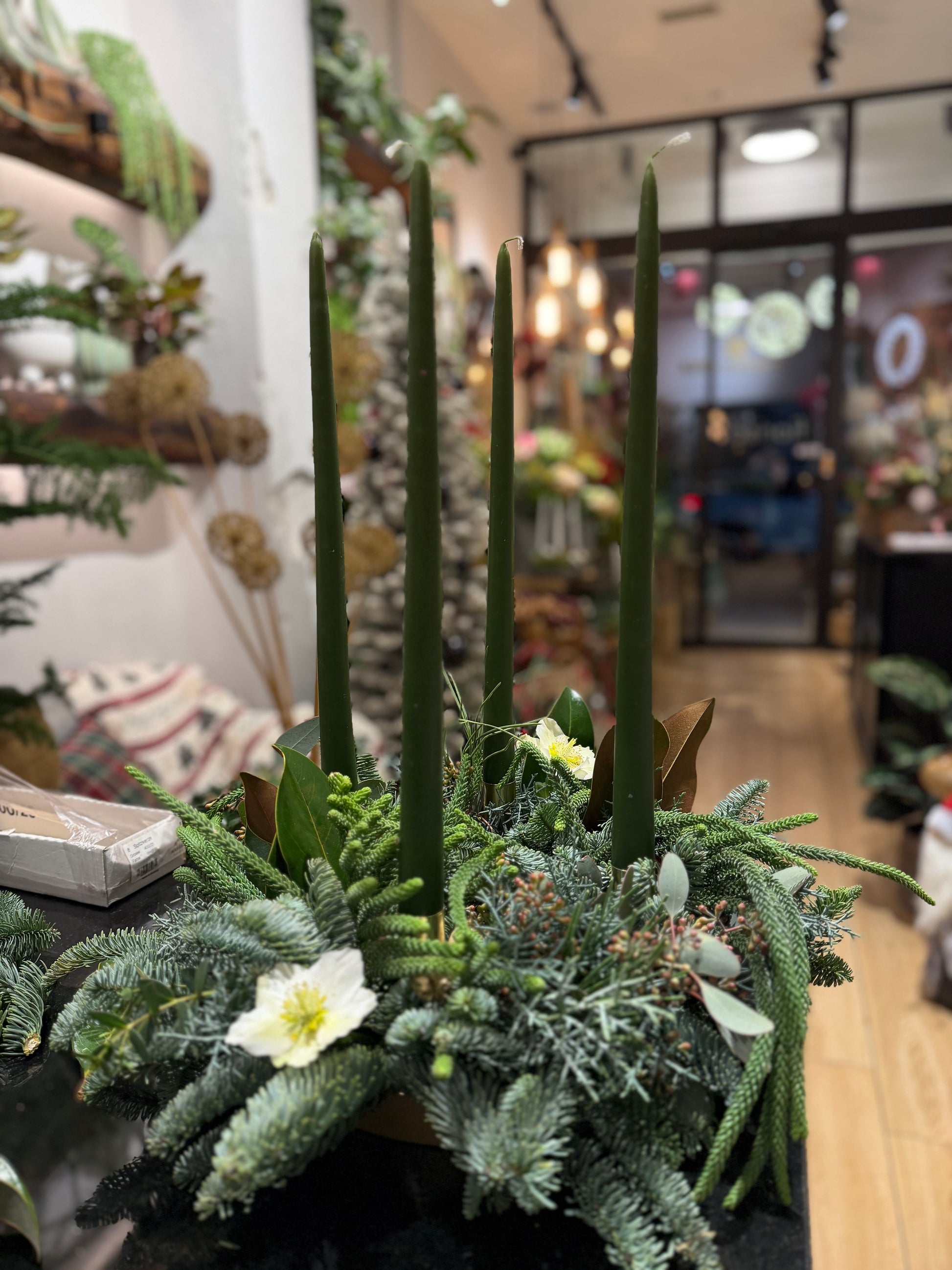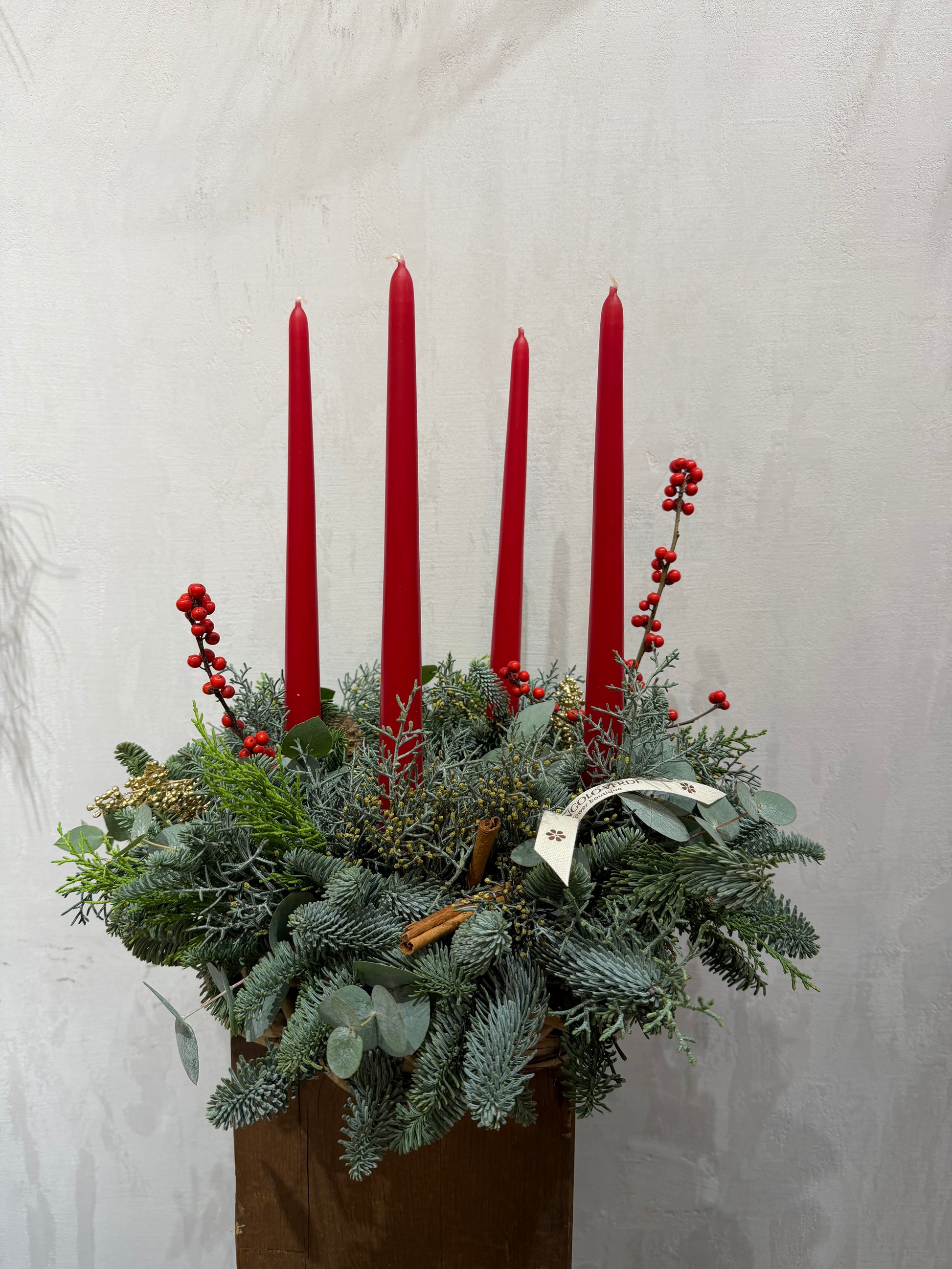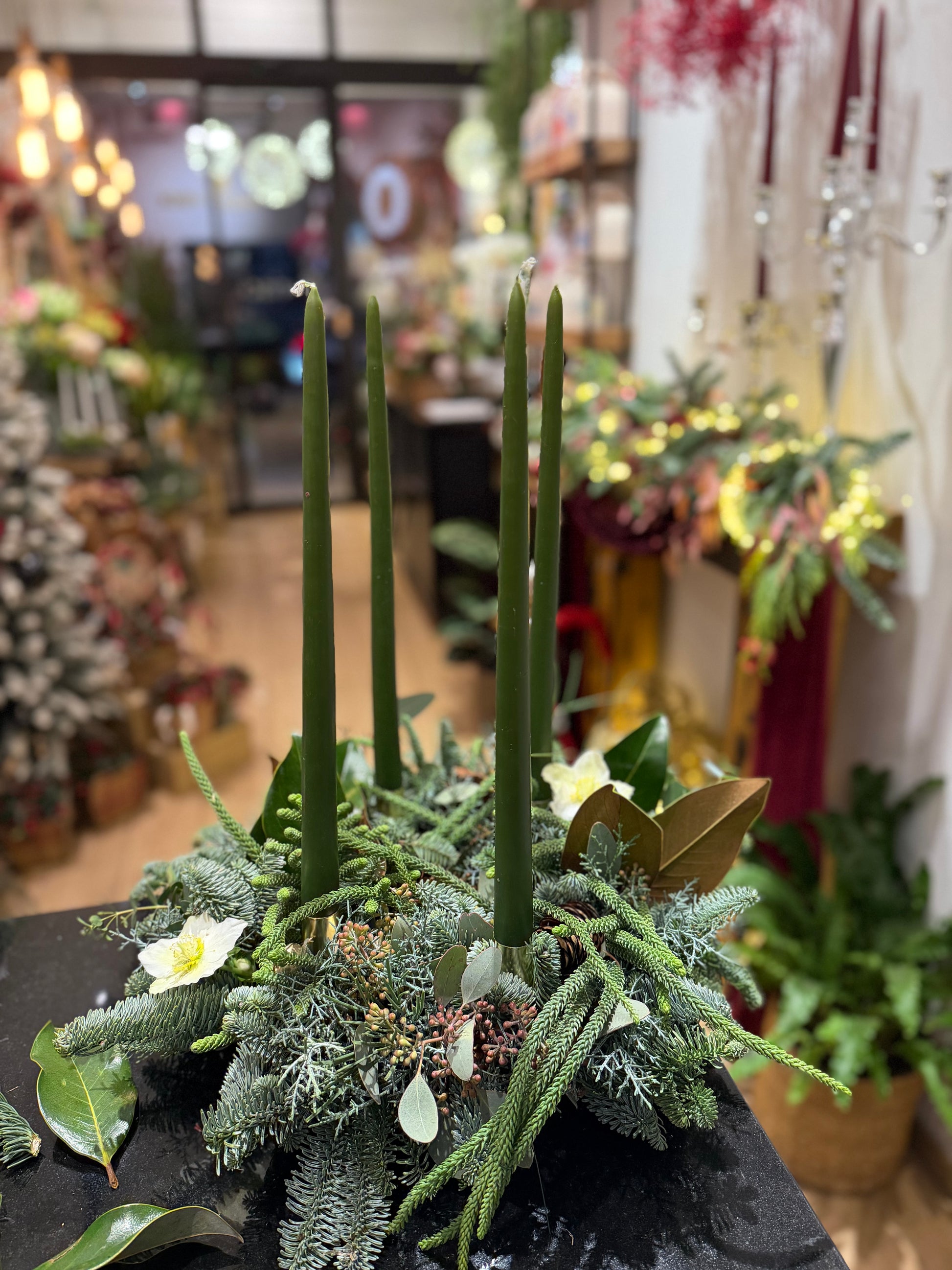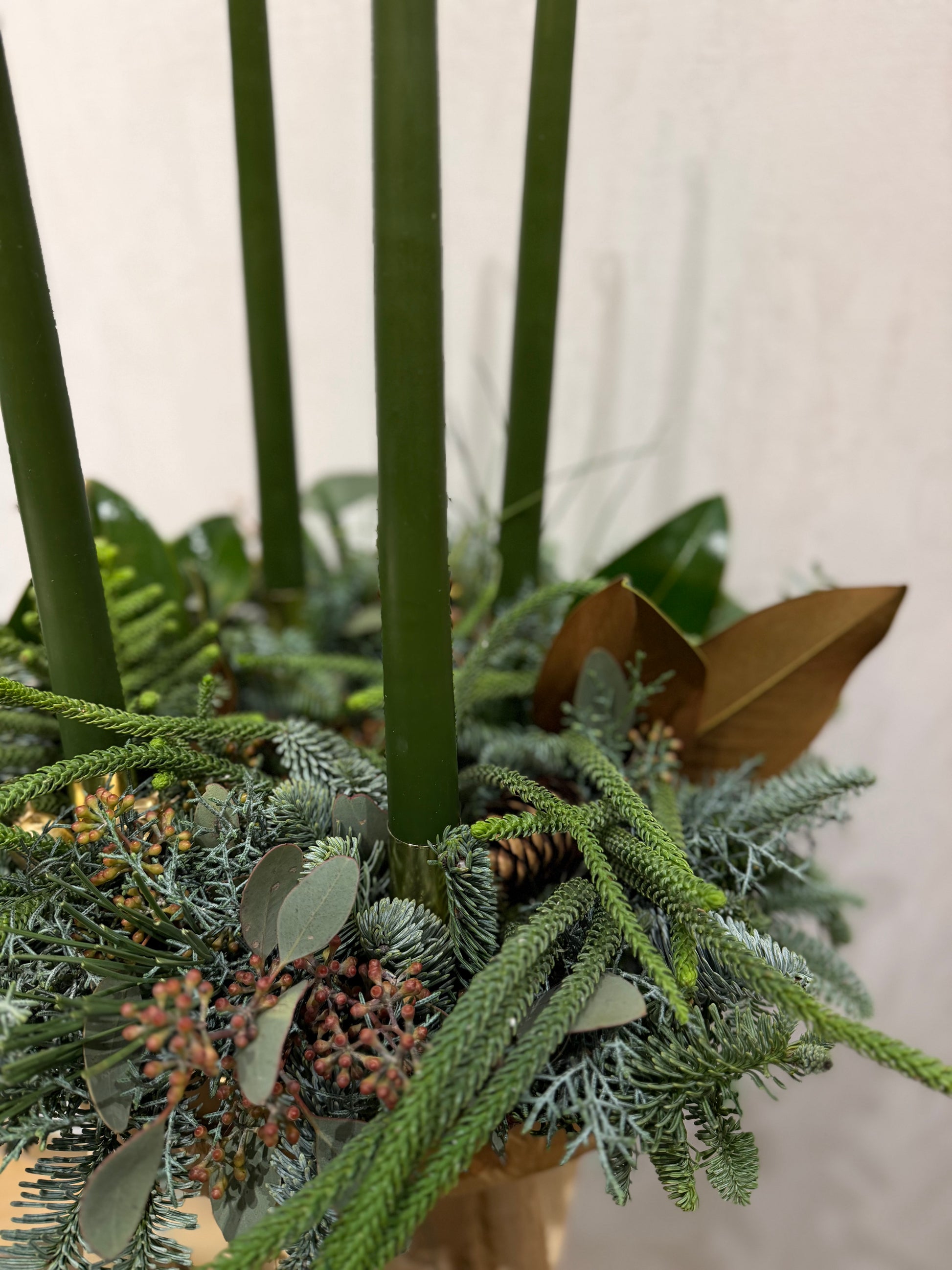 Centro tavola rotondo, ispirato allo stile classico nordico, con quattro candele alte inserite in una composizione di pino naturale e decorazioni natalizie delicate.