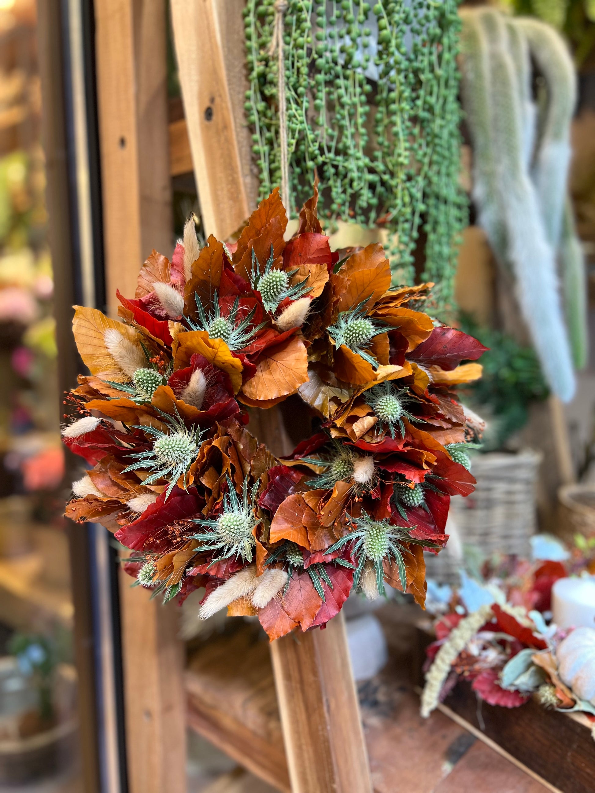 Una ghirlanda autunnale realizzata con foglie stabilizzate e colorate e dettagli di cardi, per un decoro naturale e raffinato.